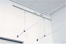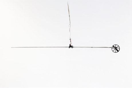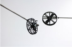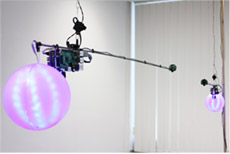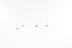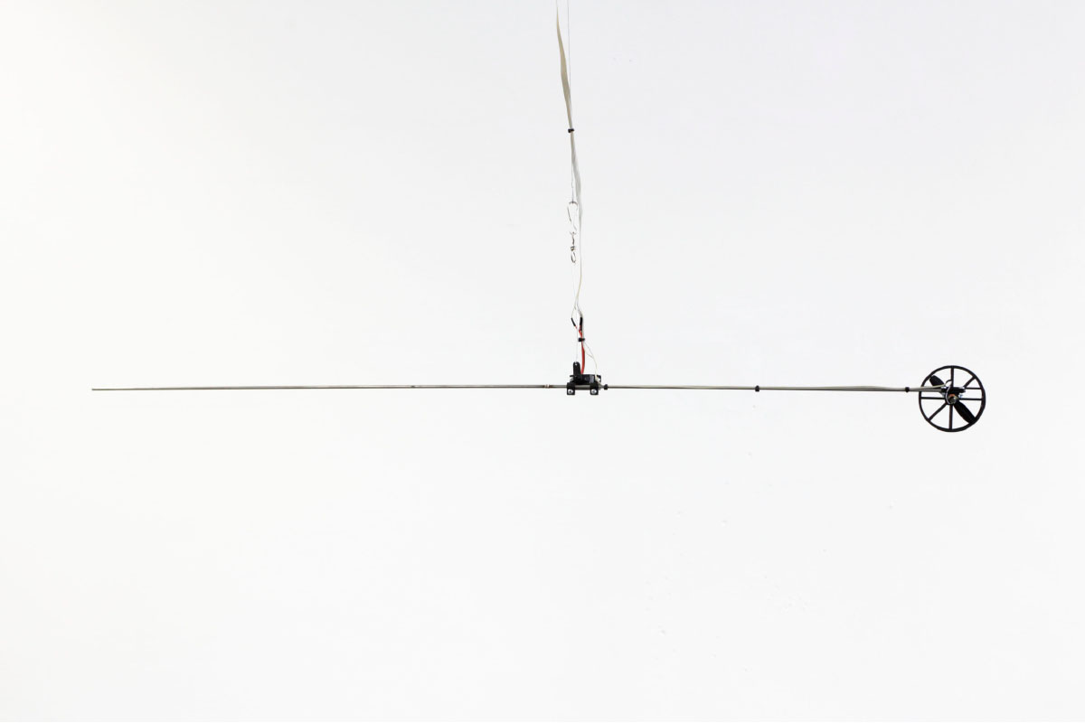 Two steel rods are hanged from ceiling and driven by propeller. One side of this pair actively rotates in the air to hit the other one. When two rods collide each other, not only the kinetic energy but also information (=propeller speed and angle of the rod) will be forwarded to the other rod. After the collision static / active side will be changed and the rods continue their movement.