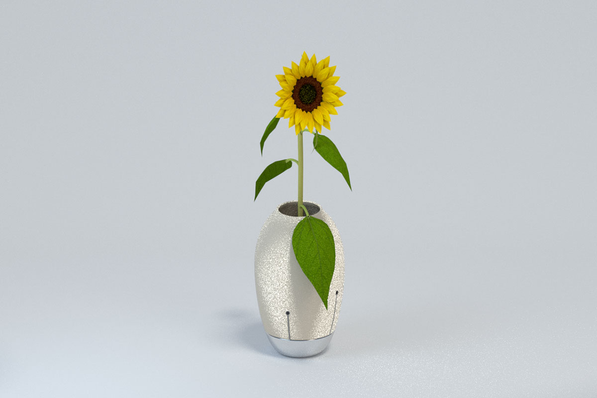 To induce user to put a sunflower to the specific direction, the mouth of the vase is slightly tilted towards one side. Electronic components are stored in the bottom, rotates the vase according to the sun position. Light sensors are attached on the vase surface to manifest it's functional capability.